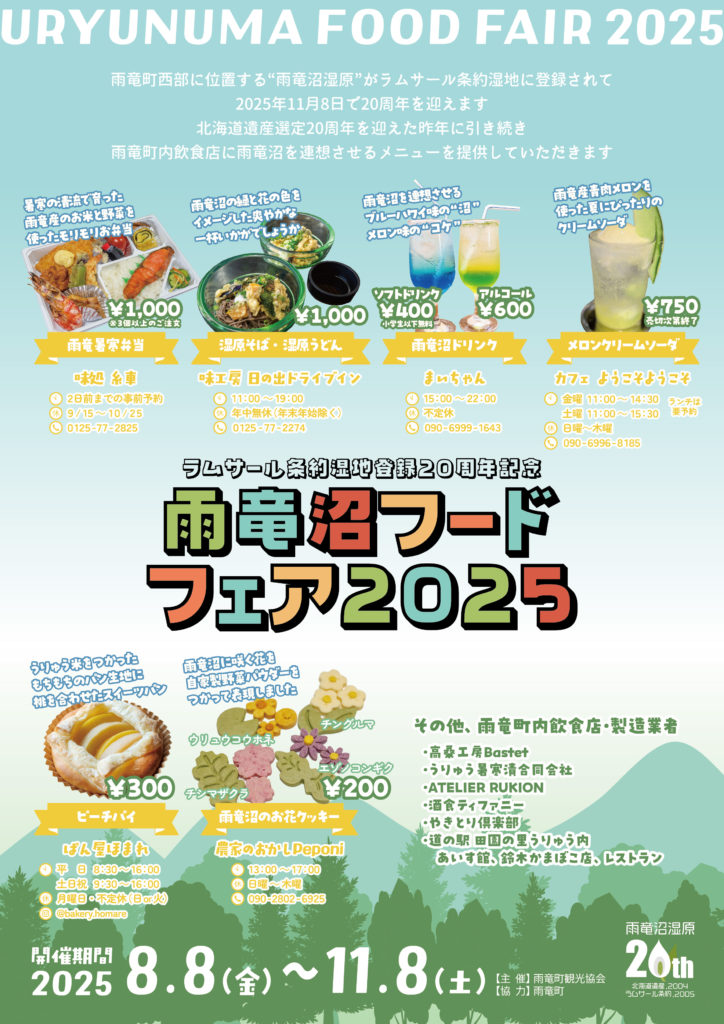 雨竜沼湿原をイメージしたフード、雨竜沼含む暑寒の清流で育った農作物を使ったフードを提供する「雨竜沼フードフェア」を昨年に引き続き開催します。