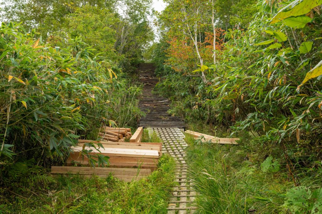 今期行われています湿原内木道工事が一段落し、展望台へ続く階段の工事へと移ります。経年劣化で今シーズンに入って、一気に崩れてしまいました。